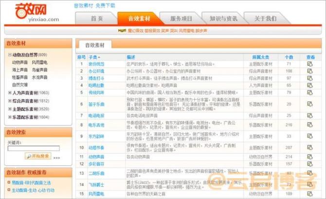 这是一个专注于各种音效的素材网站,和同类的音效素材在线下载网站相比,音效网的界面设计比较简单,但里面的音效素材库还挺丰富,而且还会不定时更新一些新的音效。网站首页根据音效种类类分成十几个版块,比如笑声音效、哭叫音效、魔幻音效、动物音效等等,右侧菜单栏还有更详细的素材分类,大家可以根据需要进行选择下载。音效素材下载方式是:在素材页面最底部找到“音效下载2”,然后右键点击其右侧的“点击下载”,在右键菜单中选择“目标另存为”。