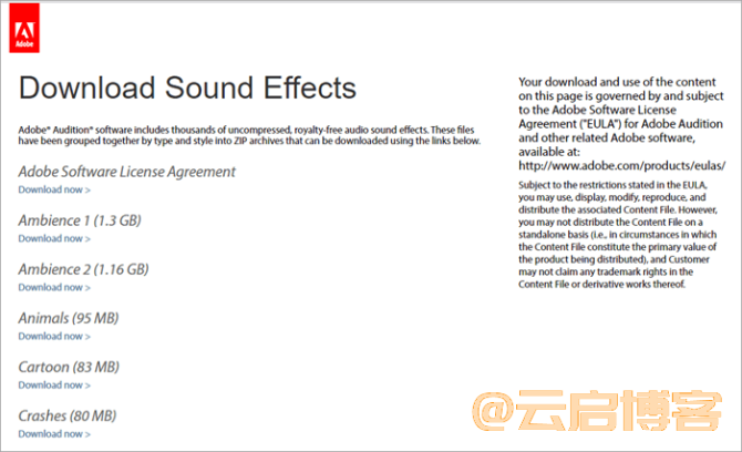 Abode公司提供上千个预先分类好的免费无版权音效包,包含各种音效类型:环境、动物、交通工具、水下、战争武器等等场景的声音。点击您所需要的音效包,无需注册登录,就可以把整个音效包下载下来了,非常的方便、好用。