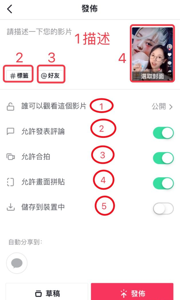 如图中所标注的①②③④⑤ 这是视频参数,之前文章有讲过参数的设置,不懂的可以回去看文章【如何设置TikTok的视频参数?】