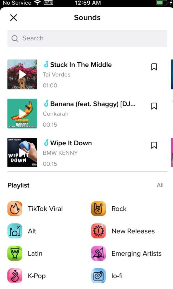 上传视频时,可以用你自己配置的音乐,也可以选择TikTok里推荐的或者自己去音乐库里搜索