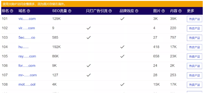 重点说下最后一个,相比其他两个,有店铺SEO流量数据指标,依据这个指标可以找到国人做爆款的店铺。爆款店铺的最大特征是,一般都是不做SEO以及没有品牌,完全依赖广告去推广店铺产品发展。