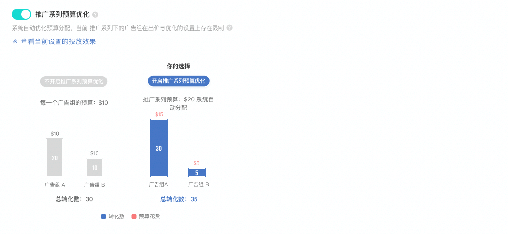 若开启,系统将会自动对优化预算分配,对该系列实现推广目标更有效果的广告组分配更多预算。