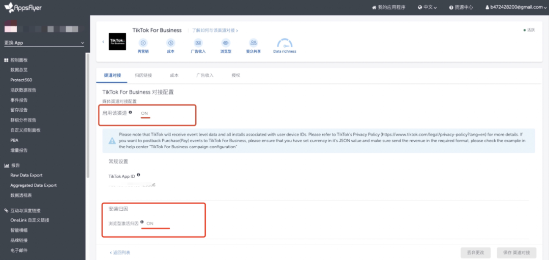 确保【启用该渠道】状态为ON;展示归因也是ON。