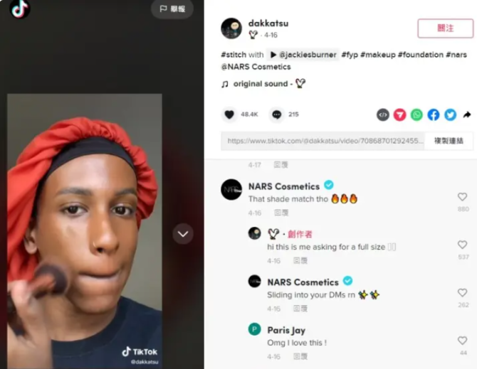 虽然评论热门视频和与大型创作者合作很好,但你的品牌也可以从与小用户的互动中受益。在与youtuber和网红Jackie Aina的TikTokStitch中,创作者@dakkatsu诚实地评价了Nars的Light reflection Foundation。