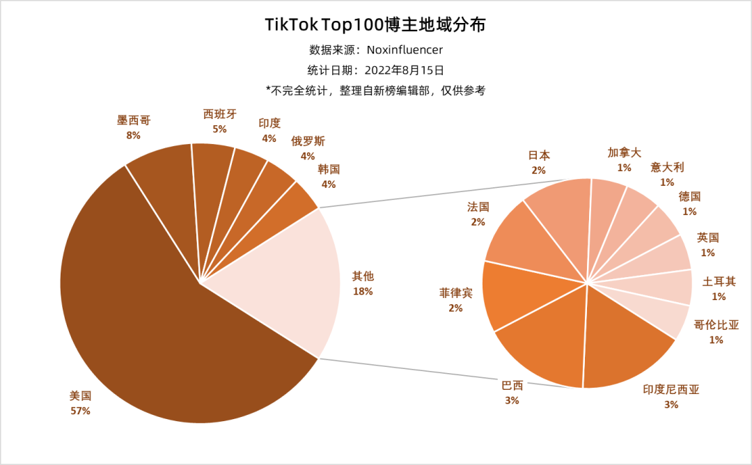 哪些国家的用户喜欢用TikTok?我们从Top100博主的地域分布可以找到些许关联。