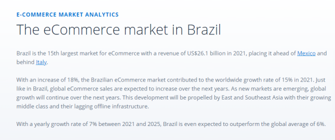 巴西目前是全球第15大电子商务市场,2021年的收入为261亿美元,领先于墨西哥,仅次于意大利。凭借2021年至2025年7%的年预测增长率,巴西甚至有望超过6%的全球平均水平。