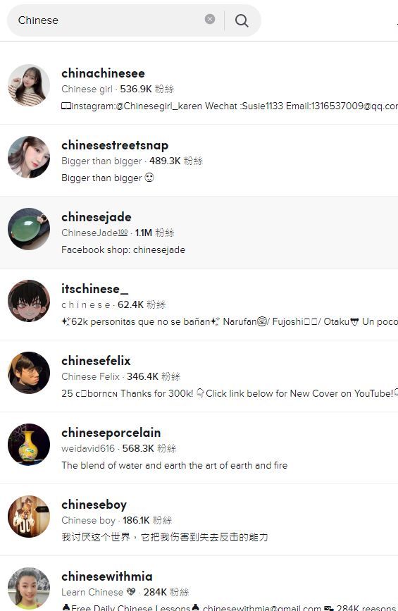 在TikTok搜索Chinese可以看出,只有536.9K粉丝的帐号“chinachinesee”却霸占了搜索第一。其内容主要是对英文单词和中文的互译,导流方式是wechat和email。