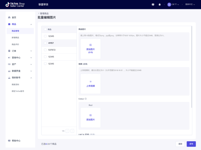 将展示前一步上传成功的商品,商家可进行批量图片、视频新增或调整。