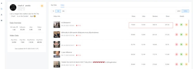 我们从Bella近30天发布视频的表现情况可以看出,她近30天最火视频的数据甚至超过了被称为TikTok的"封面"的Charli D'Amelio近30天最火视频的数据,点赞量更是高达2700万。