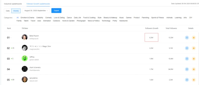 通过GugeeData涨粉排行榜(most followers on tiktok),你可以知道近期快速涨粉的播主,第一时间掌握TikTok时事流量趋势,抓住TikTok用户的喜好,从而及时调整运营方向,赶上这波流量红利期。